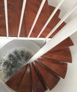 Mẫu cầu thang xoắn bậc gỗ mahogany sơn nâu cánh gián kết hợp lan can sắt và tay vịn gỗ vuông 5cm