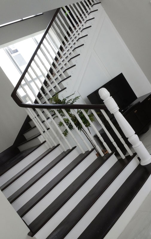 Cầu thang gỗ căm xe sơn màu nâu đậm