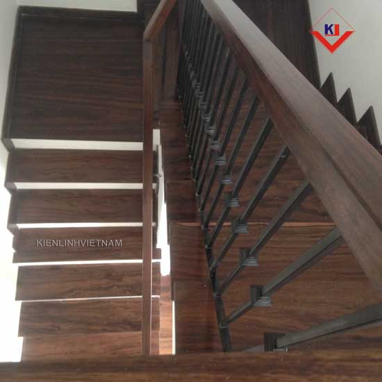 Cầu thang gỗ chiu liu tự nhiên lan can sắt tay vịn gỗ 6cm vuông