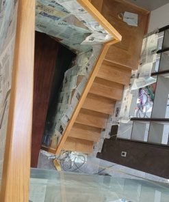 Cầu thang gõ đỏ tự nhiên lan can kính cường lực tay vịn gõ vuông 6cm