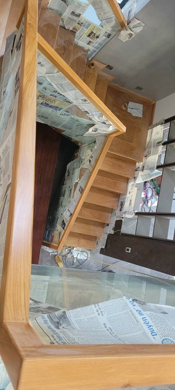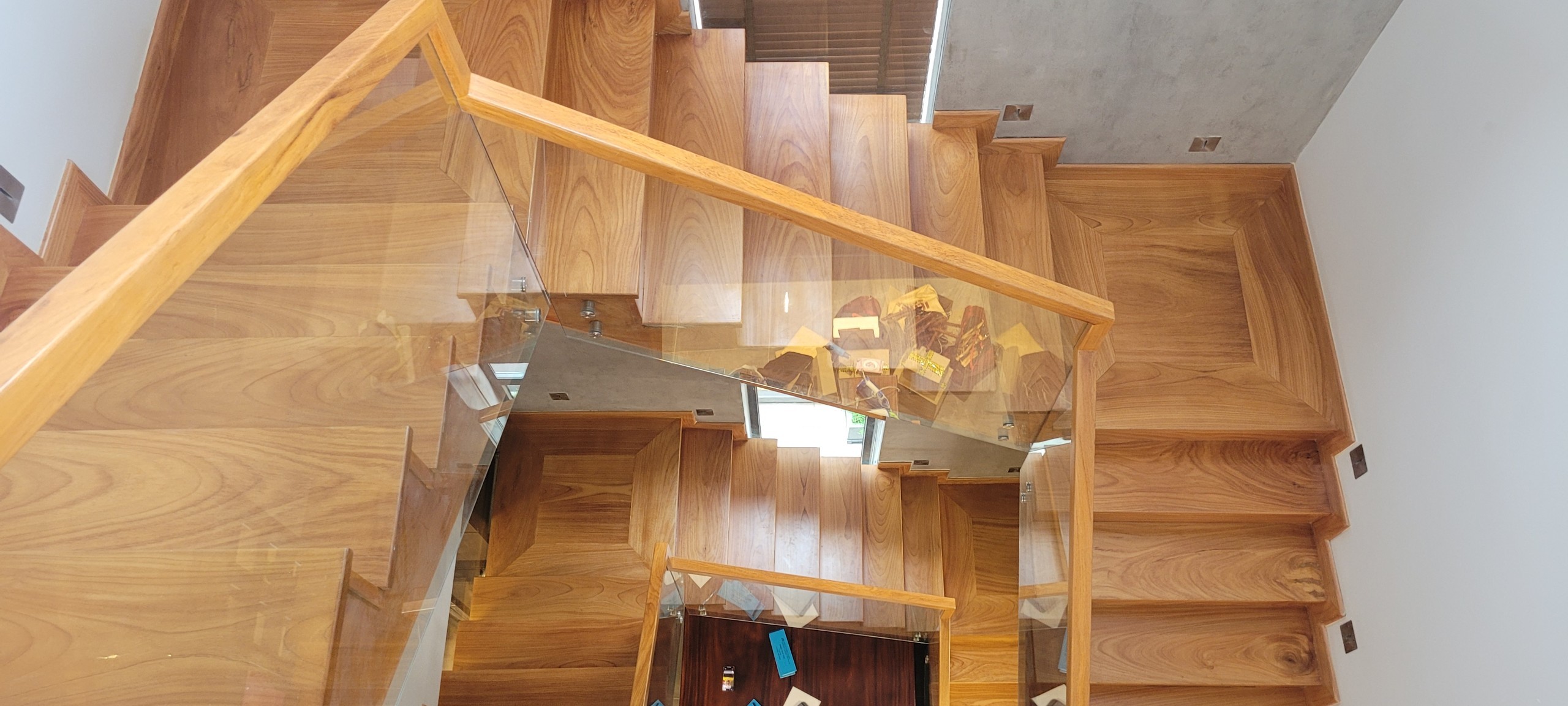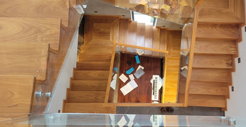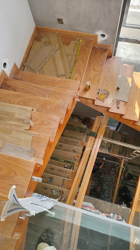 Cầu thang gõ đỏ tự nhiên lan can kính cường lực tay vịn gõ vuông 6cm