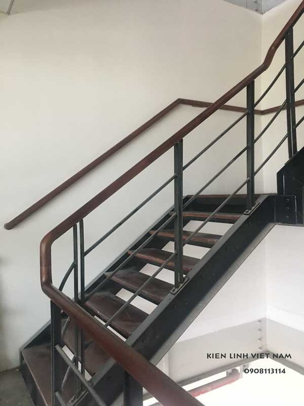 Cầu thang sắt lan can sắt bậc gỗ sồi mỹ tay vịn gỗ tròn 6cm