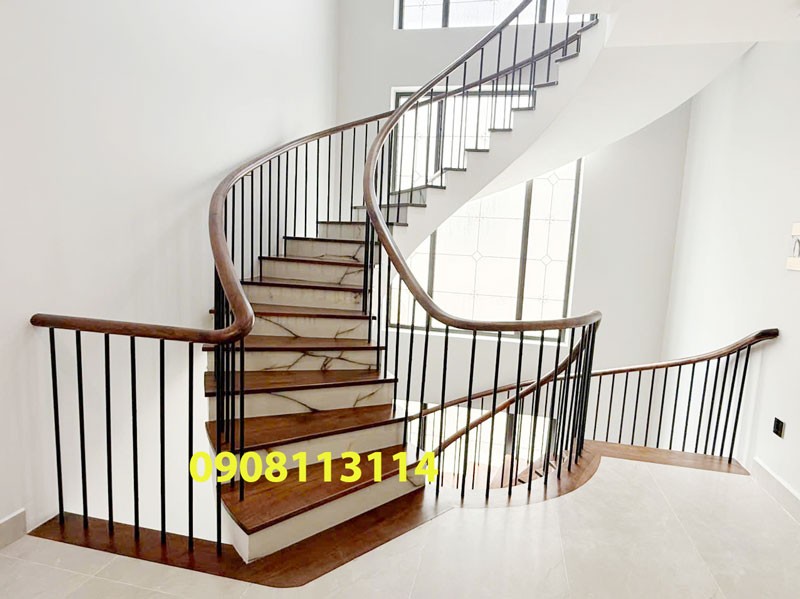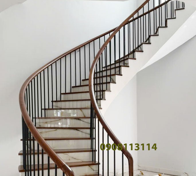 • Tay vịn cầu thang xoắn ốc: tay vịn tròn 6cm hoặc tròn 7cm, tay hạt xoài hoặc tay omega.