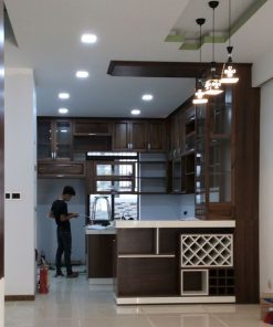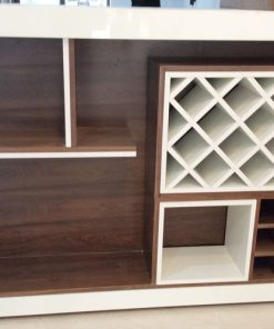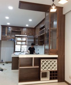 Gỗ walnut kết hợp đá trắng sứ cao cấp, đảo và bar kết hợp kệ rượu