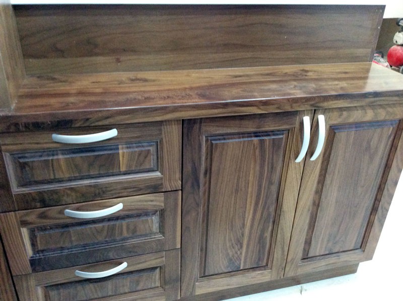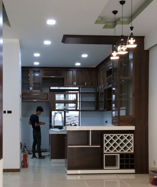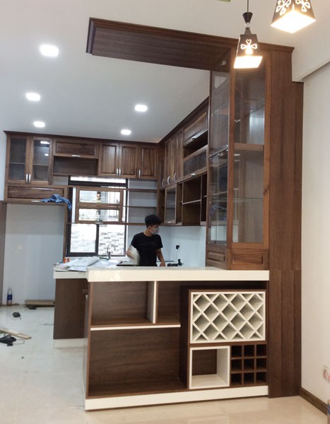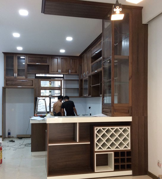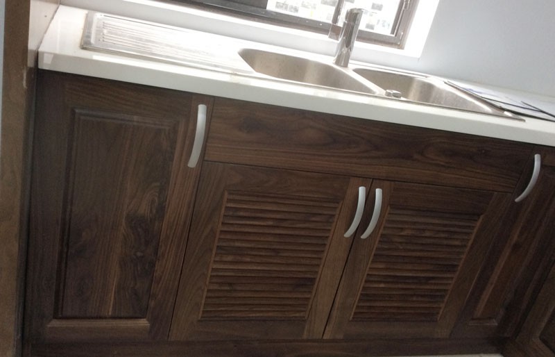 Thi công hệ tủ bếp gỗ walnut tự nhiên