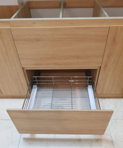 - Tủ bếp Melamin sồi là ván công nghiệp nên chỉ kháng ẩm không kháng nước, khách hàng cần thận trọng không để nước tràn ra ngoài thùng