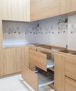 Tủ bếp Melamin sồi gồm 3 phần: cánh tủ bếp, khoang tủ bếp, khoang chậu rửa (khoang chậu rửa sẽ được thay thế bằng chất liệu Picomat – vật liệu chống nước và chống mối mọt).