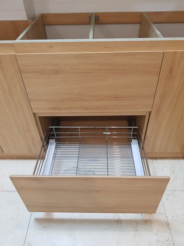- Tủ bếp Melamin sồi là ván công nghiệp nên chỉ kháng ẩm không kháng nước, khách hàng cần thận trọng không để nước tràn ra ngoài thùng